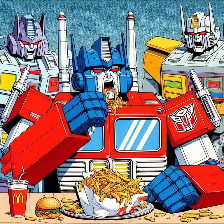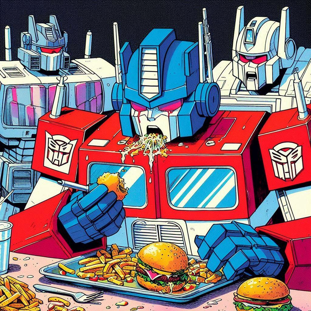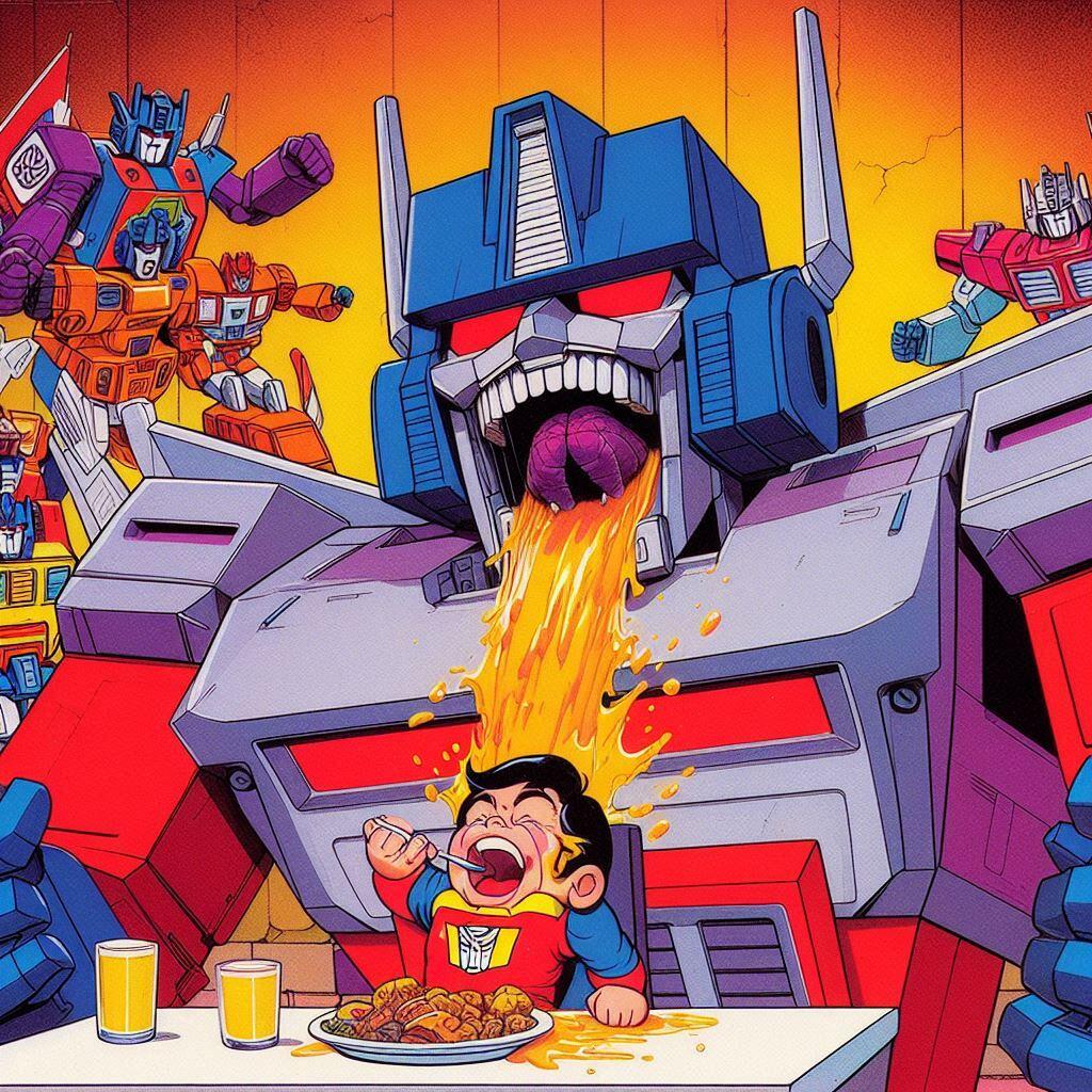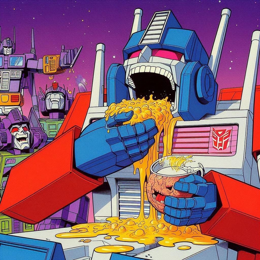 A lot of artists hate AI. I get it. But what artist is going to spend days and days drawing Optimus Prime overeating? None that I know. The quality level of these is questionable, but flipping through them gave me a chuckle. These are actually all screw ups from another idea I had called Galvatron Gulping Gavescon.