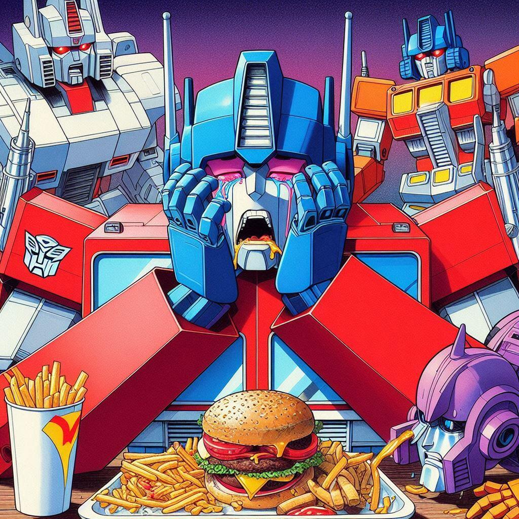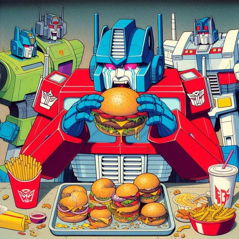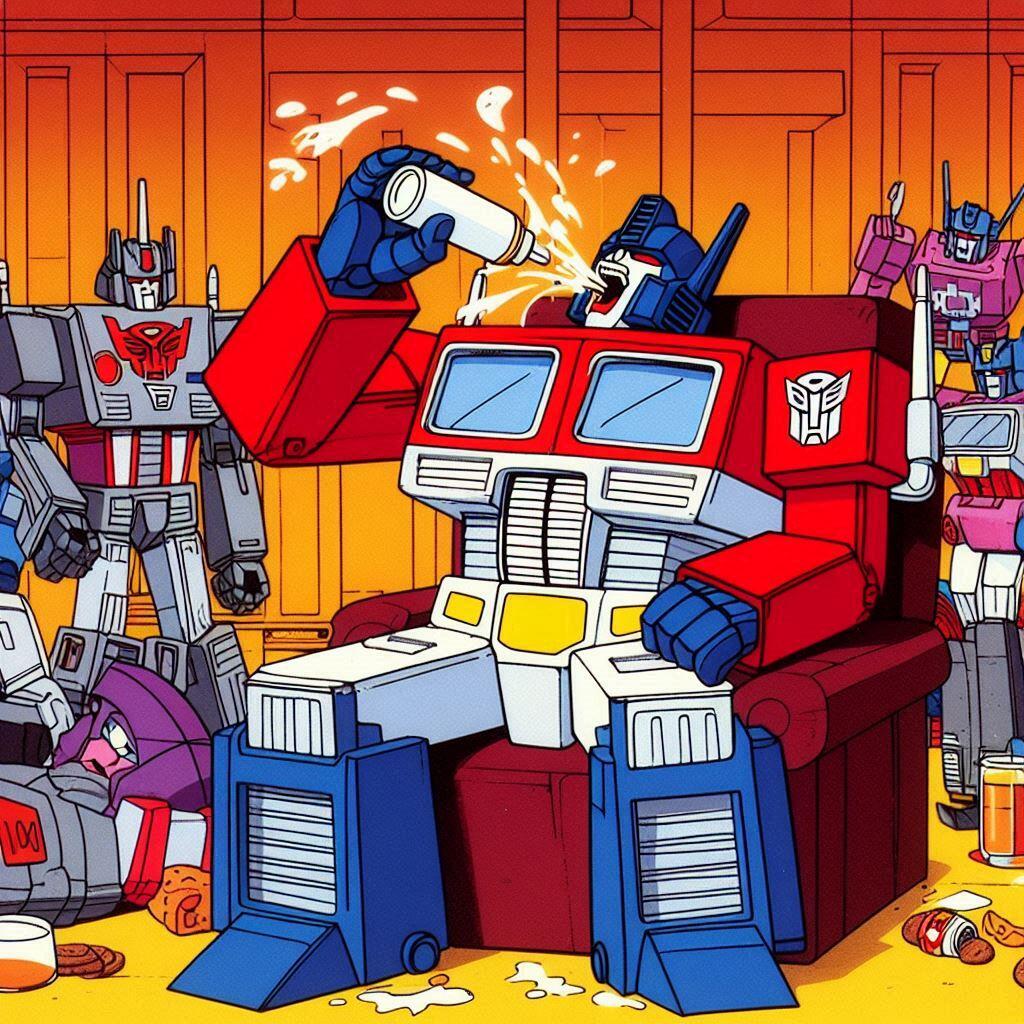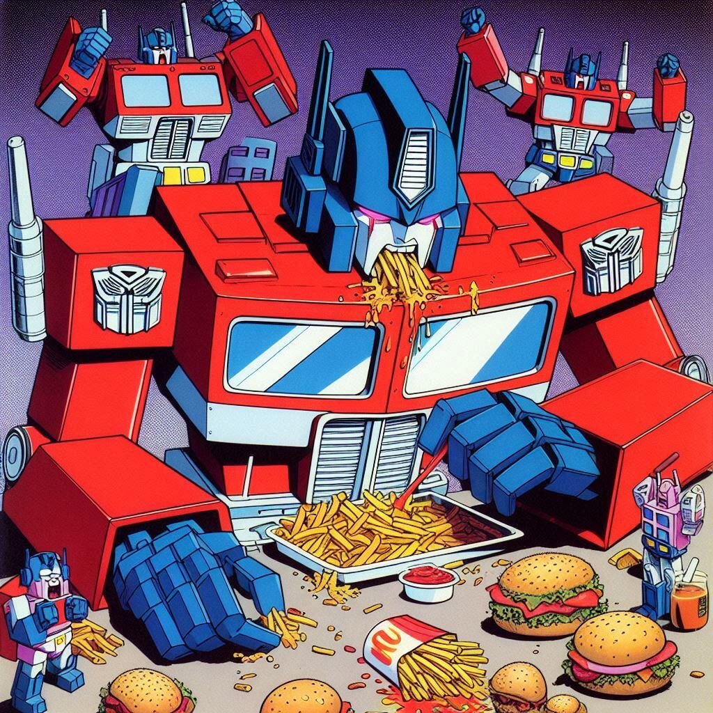 A lot of artists hate AI. I get it. But what artist is going to spend days and days drawing Optimus Prime overeating? None that I know. The quality level of these is questionable, but flipping through them gave me a chuckle. These are actually all screw ups from another idea I had called Galvatron Gulping Gavescon.